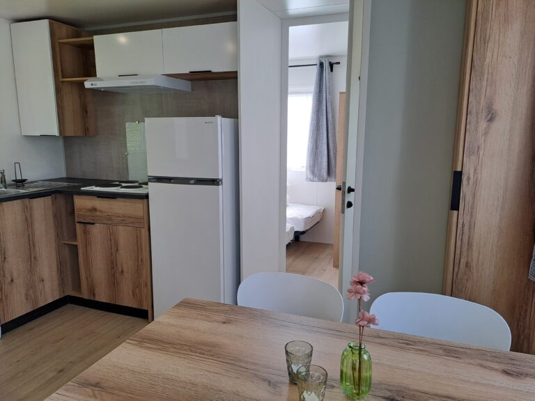 Mobilehomes er indrettet med 2 særskilte soveværelser. Det første værelse er med dobbeltseng, og walk in-closet med tremmeseng og højstol til rådighed. Det andet soveværelse er med 2 enkeltsenge. Der er bad og toilet. Fuld udstyret køkken, med kogepladser, køl/fryseskab, opvaskemaskine, El kedel. I skabene er der gryder, stegepande og service til 6 personer. Flot stor træterrasse med handicap venlig adgangs forhold. På terrassen er der møbleret med bord, stole og solsenge. Der er dyner og puder til rådighed. Linned og håndklæder skal medbringes eller det kan lejes ved bookingen.